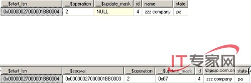 要抽取已经启动CDC的表的改动,你需要提供相关的LSN。LSN是指在识别数据库事务处理日志里的条目的唯一日志序列号。如果这是你第一次进行查询抽取表改动,你可以使用函数sys.fn_cdc_get_min_lsn()和函数sys.fn_cdc_get_max_lsn()来获得最小LSN和最大LSN。如果在启动表的CDC时,设置@supports_net_changes=1,你可以使用cdc.fn_cdc_get_net_changes_dbo_customer()来查询净改动。这个函数会根据你启用CDC时指定的主键或唯一索引把多个改动集合到一行中。这样你可以随时调用cdc.fn_cdc_get_all_changes_dbo_customer()来获取表中序列号在LSN范围之内的任何改动。函数名称中的dbo_customer部分是数据捕捉实例;这是默认的schema_tablename。以下是上面的查询的结果: