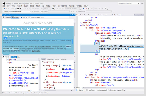 对于 Web 开发,Visual Studio 2012 也为您提供了新的模板、更优秀的发布工具和对新标准(如 HTML5 和 CSS3)的全面支持,以及 ASP.NET 中的最新优势。 此外,您还可以利用 Page Inspector 在 IDE 中与正在编码的页面进行交互,从而更轻松地进行调试。 那么对于移动设备又如何呢? 有了 ASP.NET,您现在便可以使用优化的控件针对手机、平板电脑以及其他小屏幕来创建应用程序。