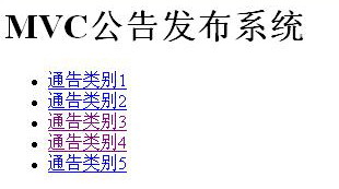 现在,我们来实现公告系统中的第一个页面——首页。它非常简单,只包括所有公告分类的列表,并且每个列表项是一个超链接。其中分类数据是用我们的Mock组件得到的。实现后界面如下: