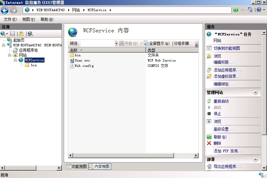 首先我们将WCF应用程序发布一下,然后部署在B服务器的IIS之上,如下图所示: