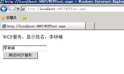 1 <%@ Page Language="C#" AutoEventWireup="true" CodeBehind="WCFTest.aspx.cs" Inherits="WCFClient.WCFTest" %> 2 3 <!DOCTYPE html PUBLIC "-//W3C//DTD XHTML 1.0 Transitional//EN" "http://www.w3.org/TR/xhtml1/DTD/xhtml1-transitional.dtd"> 4 <html xmlns="http://www.w3.org/1999/xhtml"> 5 <head runat="server"> 6 <title></title> 7 </head> 8 <body> 9 <form id="form1" runat="server"> 10 <asp:TextBox ID="txtName" runat="server"></asp:TextBox><br /> 11 <asp:Button ID="btnSubmit" runat="server" Text="测试WCF服务" OnClick="btnClick" /> 12 </form> 13 </body> 14 </html> 15 16 using System; 17 using System.Collections.Generic; 18 using System.Linq; 19 using System.Web; 20 using System.Web.UI; 21 using System.Web.UI.WebControls; 22 23 //引用WCF服务的名称空间 24 using WCFClient.WCFService; 25 26 namespace WCFClient 27 { 28 public partial class WCFTest : System.Web.UI.Page 29 { 30 protected void Page_Load(object sender, EventArgs e) 31 { 32 33 } 34 35 protected void btnClick(object sender, EventArgs e) 36 { 37 UserClient user = new UserClient(); 38 string result = user.ShowName(this.txtName.Text); 39 Response.Write(result); 40 } 41 } 42 }