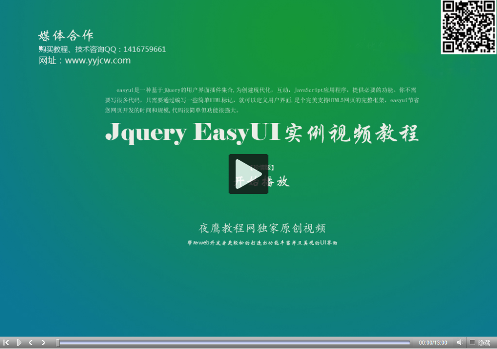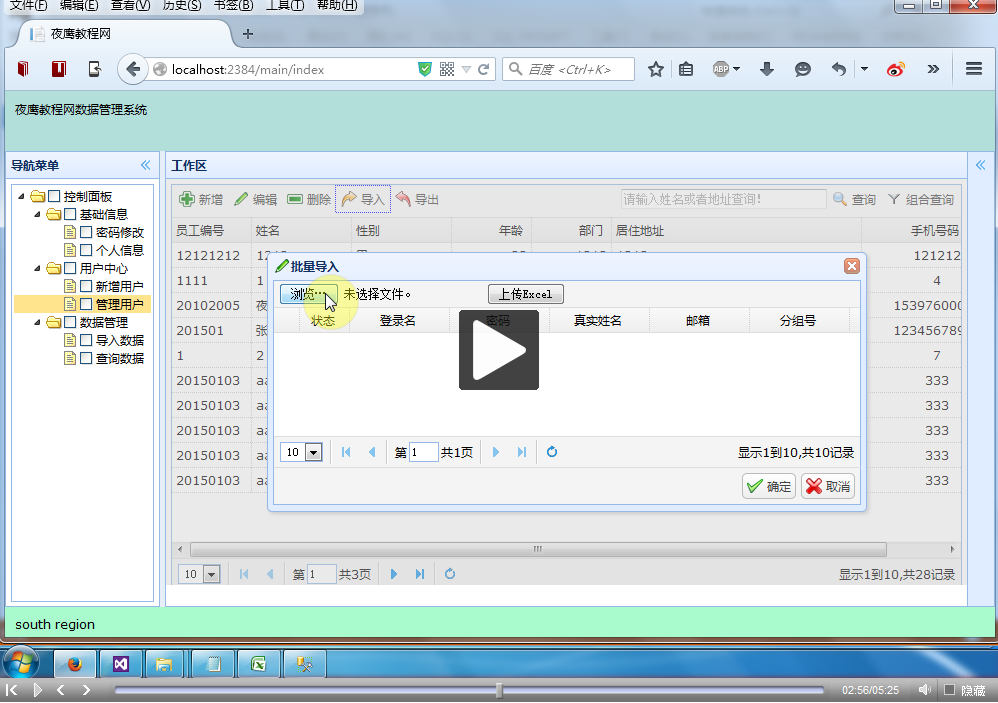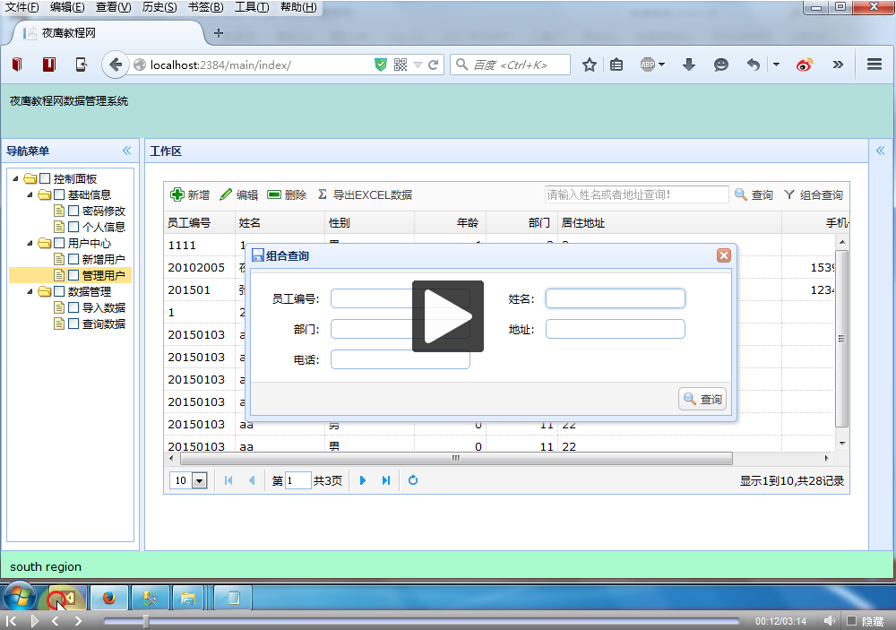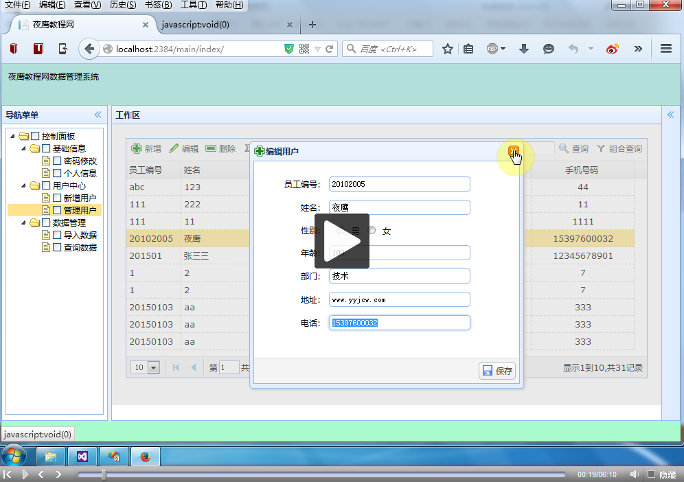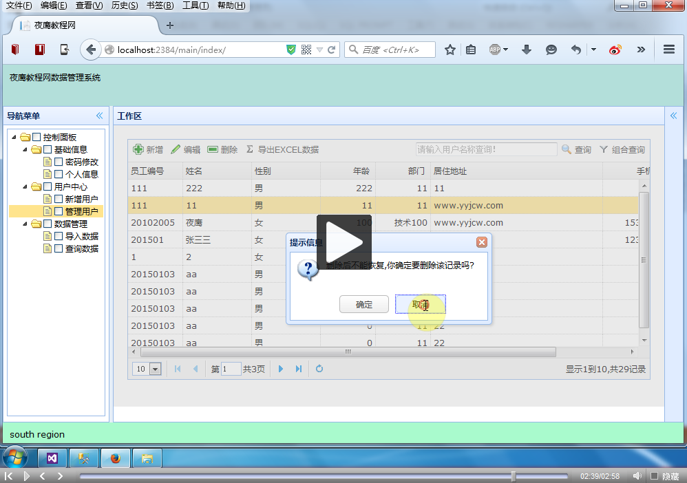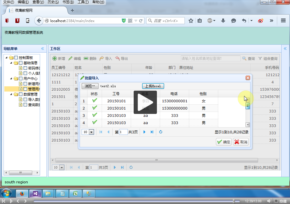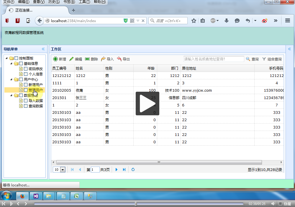 本套教程主要讲解了easyUI和mvc结合开发项目的实例,以用户管理为模型,用easyUI做了数据表格的增加,删除,修改 分页,普通查询,组合查询,以及后端参数的接收和响应,导出EXCEL,批量导入数据等。特别是easyUI form序列化与反序列化,json传输和解析,数据列表批量post与接收,MVC框架等,这些技术是项目开发过程中经常会用到的,另外值得注意的是本套教程讲解的excel批量导入导出数据的方法不需要在服务器安装office软件,简化了配置。希望通过本套教程的学习,提升同学们开发MVC系统的信心和开发大型项目的能力。